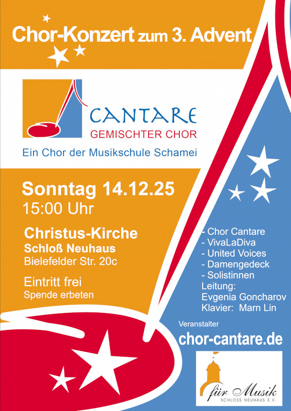 Zu seinem traditionellen vorweihnachtlichen Konzert laden der gemischte Chor Cantare der Musikschule Schamei und viele weitere Mitwirkende am 3. Adventssonntag, den 14.12.2025 um 15 Uhr in die evangelische Christuskirche in Schloß Neuhaus ein. Unter der Leitung von Evgenia Goncharov stimmen…